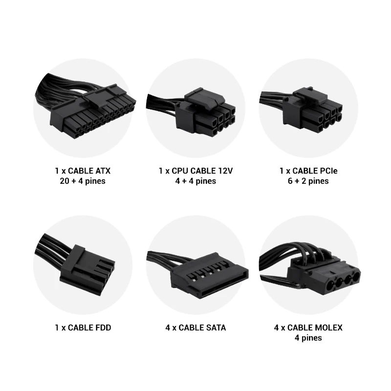 - Cables mallados de 500mm de longitud para su uso en chasis de gran tamaño con independencia de la posición de la fuente en el chasis.